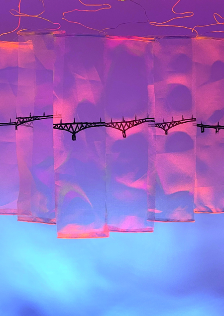 «Местом притяжения» для саратовцев и гостей — это река Волга, на котором располагается Саратовский мост, что соединяет Энгельс и Саратов. Этот символ города я попыталась изобразить, как тень «столицы Поволжья»*. «Тень», способствующее вспомнить пройденный путь, который оставляет большой отпечаток в жизни жителей. У каждого человека своя уникальная дорога. Моя цель, пробудить, впервую очередь у саратовцев, то самое родное ощущение. Углубить чувства любви к родному городу. Подчеркнуть красоту, неповторимость малой родины.