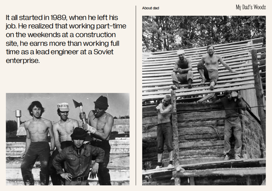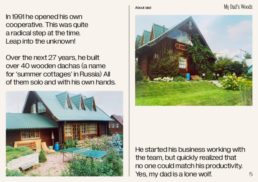 Dad has been working with wood since 1889 and has built over 40 dachas or timber cottages over the past 27 years. All of them on his own with his bare hands.