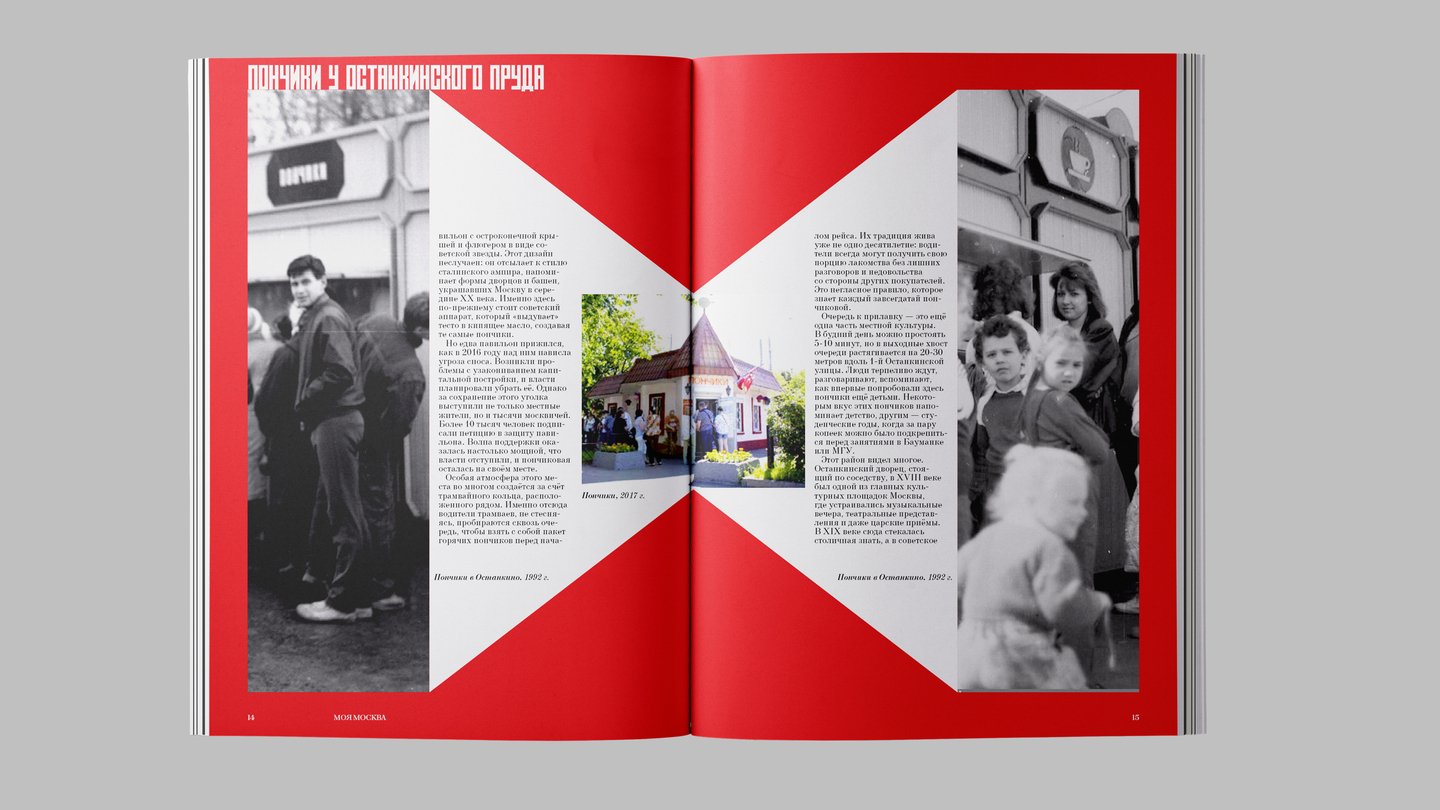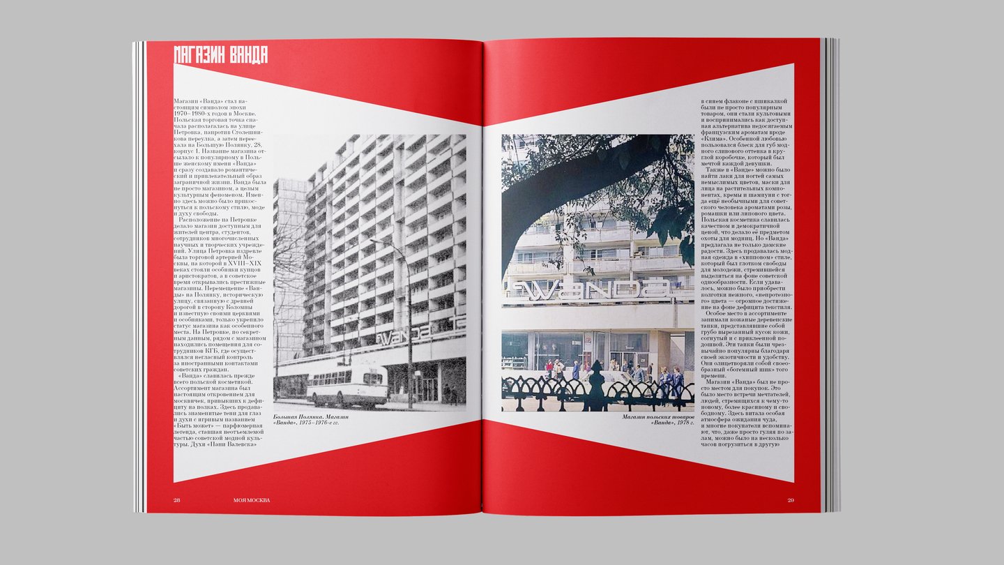 In at the very beginning of the project, interviews were conducted among older generations about the their favorite places in Moscow since Soviet times. These memories have become the basis of the entire project. On the basis of the interviews, magazines were created to describe the history of important Moscow sites. These places were located in the basic guide < 365 days in Moscow» a also became key elements in all identical carriers.