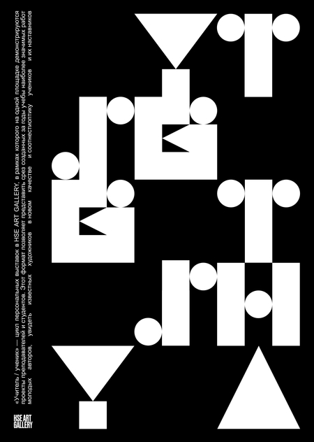 «Учитель / ученик» — цикл персональных выставок в HSE ART GALLERY, в рамках которого на одной площадке демонстрируются проекты преподавателей и студентов. Этот формат позволяет представить срез созданных за годы учебы наиболее значимых работ молодых авторов, увидеть известных художников в новом качестве и соотнести оптику учеников и их наставников.