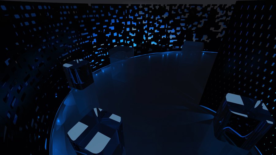 promt// Bar, technological space, smooth surfaces, round counter, white furniture, glass vertical lights above the counter, dimmed light, metal panels on the walls, vertical LED lighting in blue shade, water in a jug, glasses