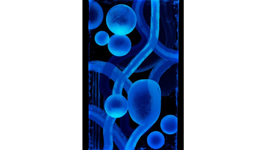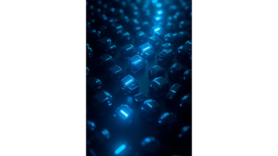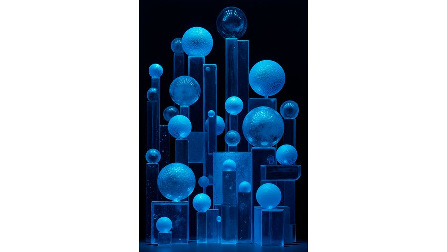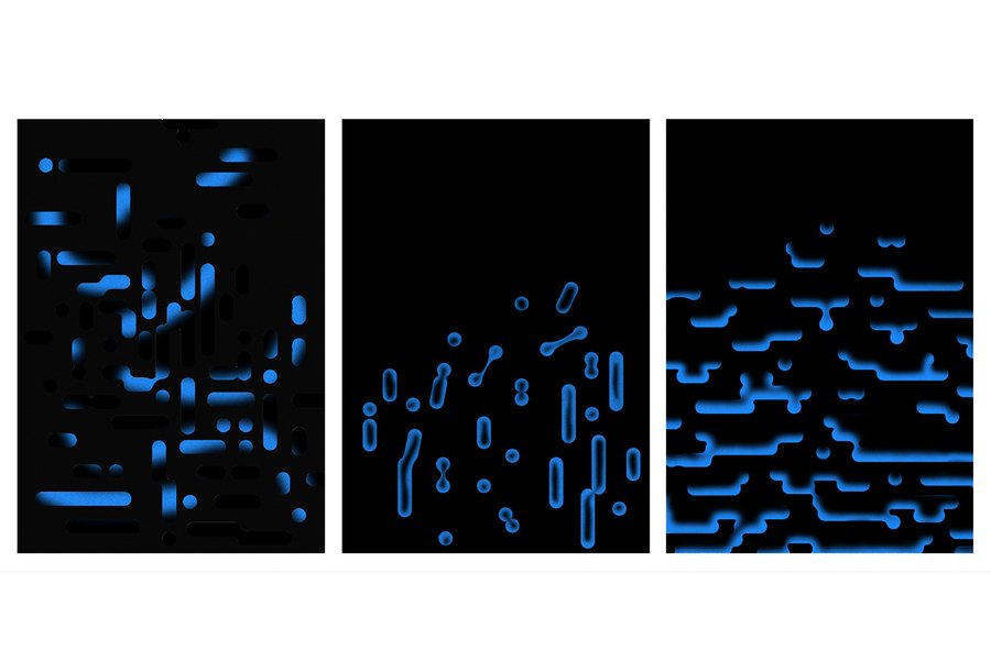 promt// pattern, spheres, elongated rectangles with skimming, one thickness, flowing, glow effect inside shapes, blue light, ulramarine color, black background