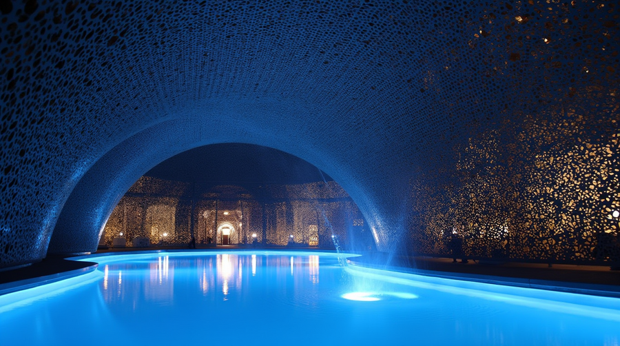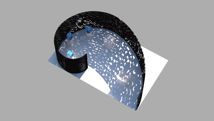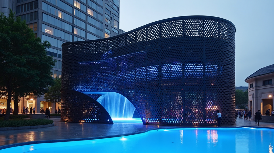 promt// Exhibition pavilion, spiral shape, perforated, black metal, water filters, blue illumination