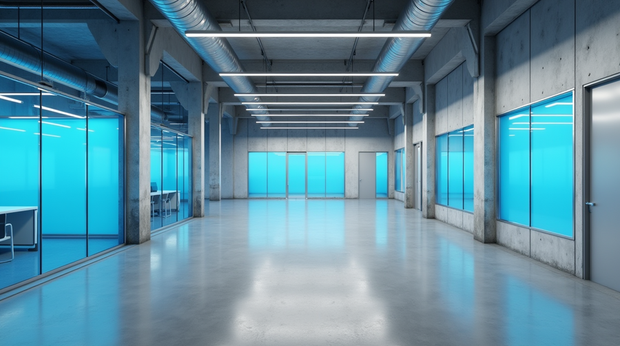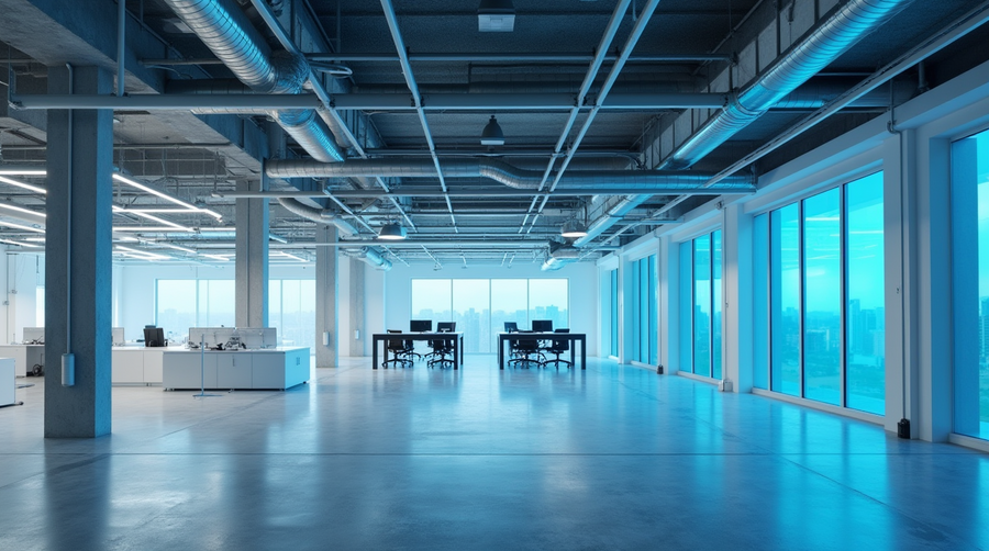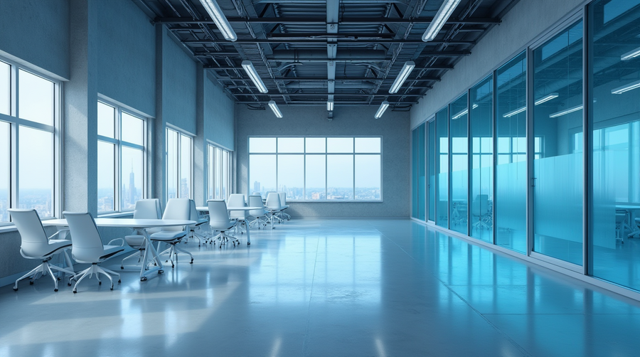promt// office, large space, high ceilings, concrete walls, metal panels, glass partitions in blue shade, white furniture, LED lighting