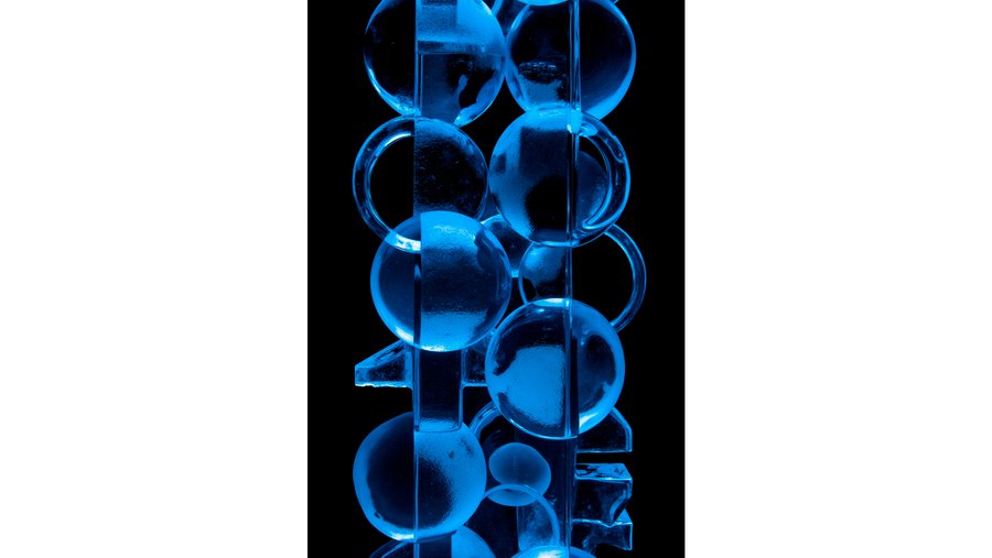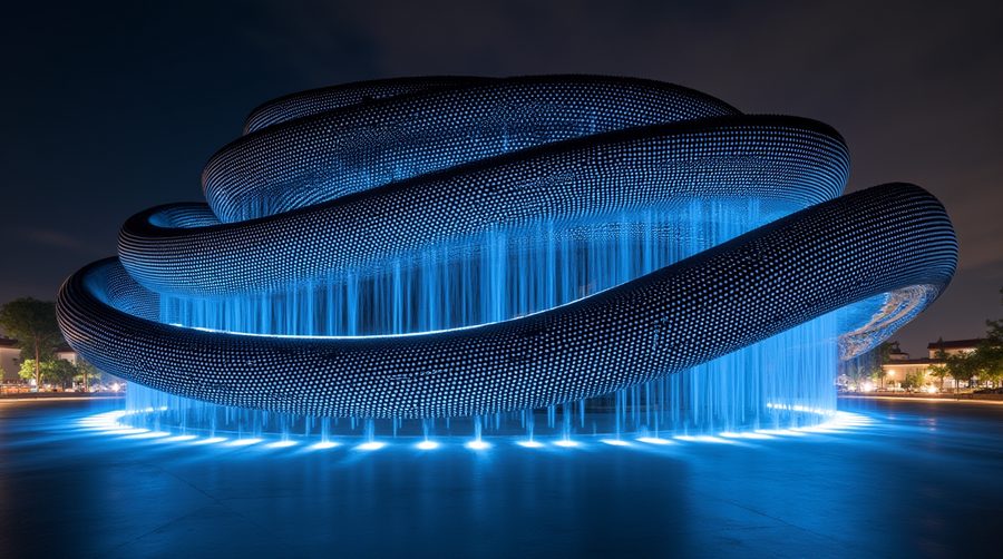 promt// Exhibition pavilion, spiral shape, perforated, black metal, water flasks for filtration, blue illumination, city square