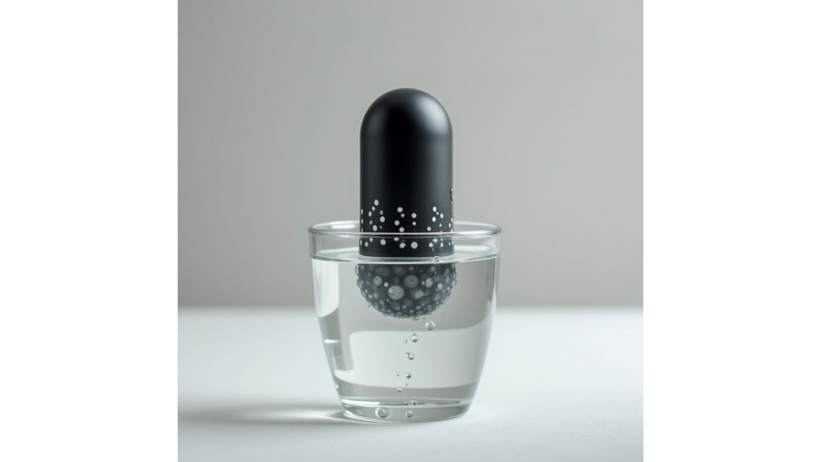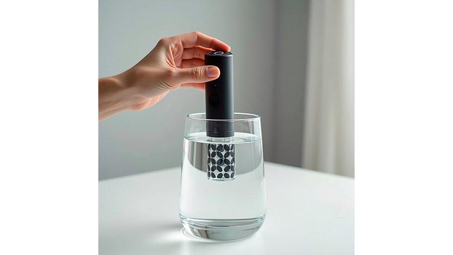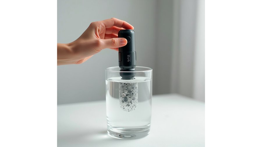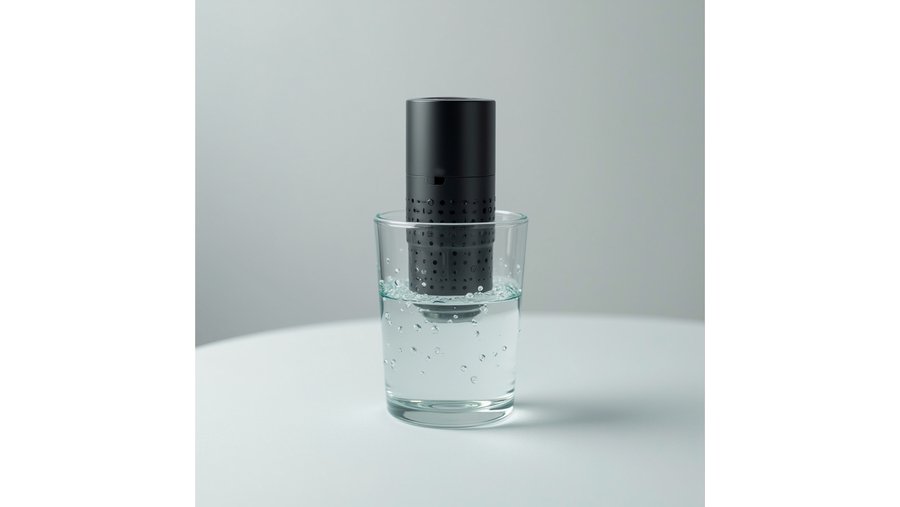 promt// Create a technological water filter in the form of a small black metal capsule with perforations in the shape of various circles, with a power button on top. The filter itself is held by a woman’s human hand, which places the filter into a large cylindrical cup of clear water. A macro shot allows you to see how the filter allows the water to pass through the perforations. The space in which all this takes place is neutral, with white and gray matte surfaces. The light is soft, neutral.