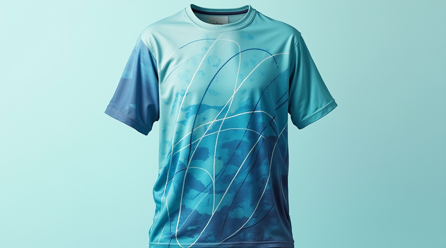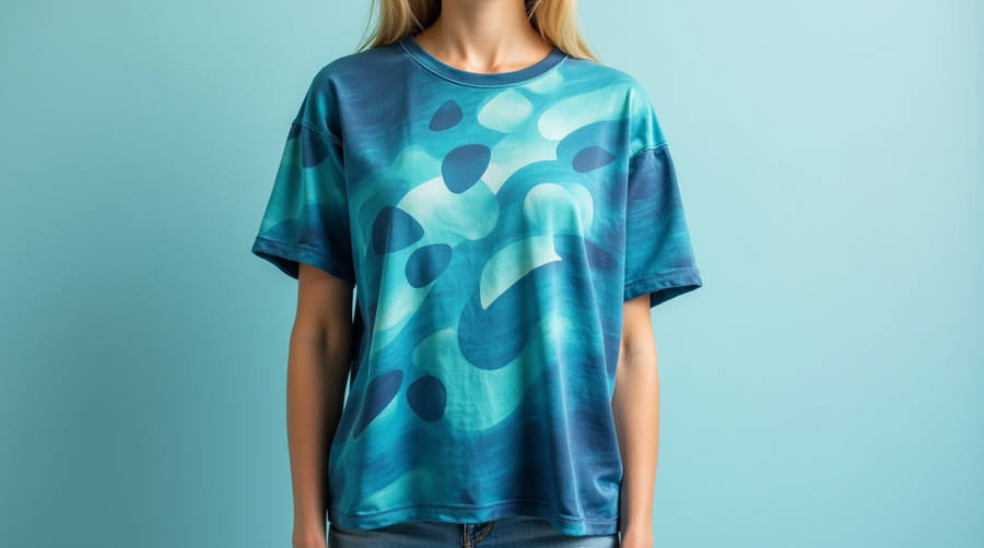 promt// T-shirt on model for a brand for creating technological water filters, loose fit, pattern, spheres, elongated rectangles with streamline, shape flowing effect, turquoise blue color, pale turquoise color, dark almost blueberry with shades of turquoise and aquamarine color, navy blue color, black pearl color, natural light