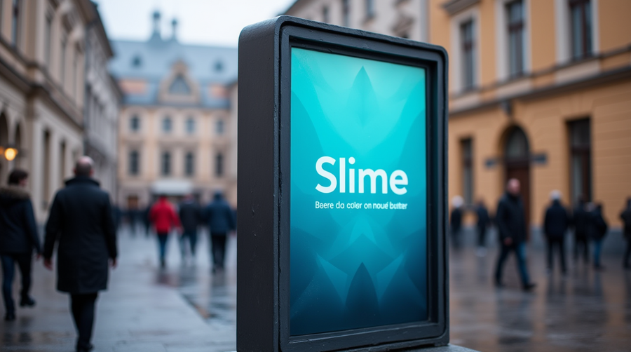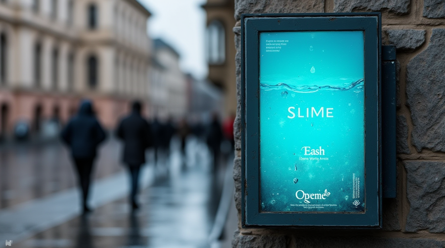 promt// create a mocap of a small billboard in an urban environment with historical buildings like Saint-Petersburg, in mocap put up a promotional poster for the exhibition and sale of technological water filters, the brand name «Slime» should be displayed in the center, use a grotesque minimalist font, use turquoise blue, Pale turquoise, dark almost blueberry with shades of turquoise and aquamarine, navy blue, black pearl colors, the people around are blurred, the space is clean, the light is soft, effect rainy day, black and white effect