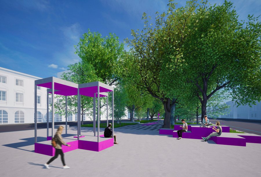 Сетка картины была наложена на план бульвара. - Большие вертикальные прямоугольники стали газоном - Маленькие вертикальные прямоугольники стали основой для арок с LED-экранами и местами для сидения на образовавшихся мини-площадях и боковых частях с газонами - Некоторые сочетания пикселей были использованы для создания арт-объектов, напоминающих разных персонажей.