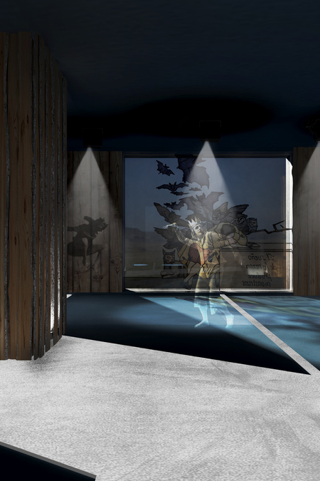 Зал Хитро-сна — это помещение, отражающее концепцию отеля: «погруженный в сон» зал освещается тусклым светом проекторов и дорожки, по которой идет зритель. Тихо! Жители Хитровки спят. Посмотрим, что им снится?