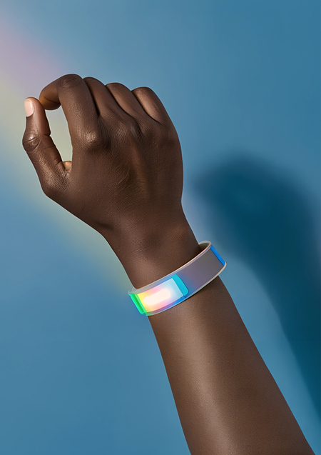 Prompt / blender octane render of a futuristic bracelet music portable speaker that changes color