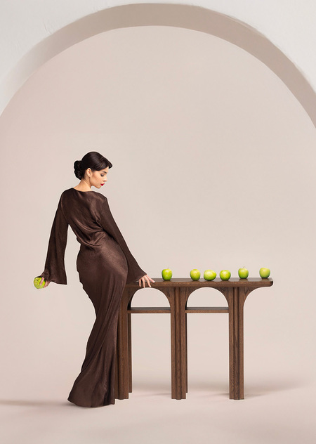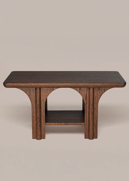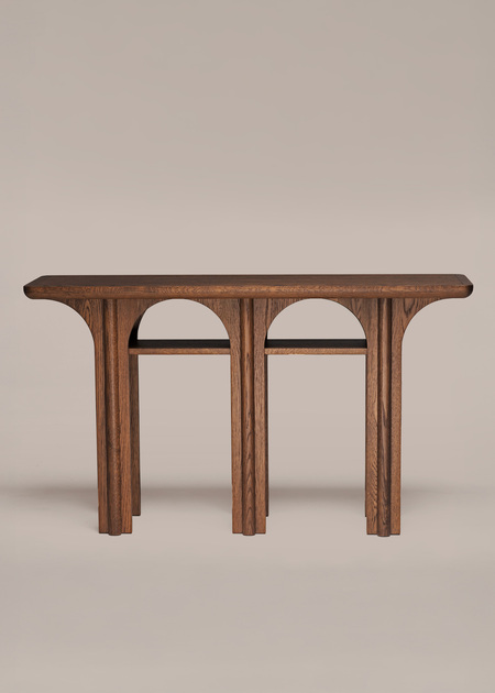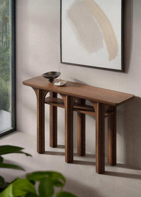 Its silhouette is simple yet expressive: arched legs, a refined shelf, and precise geometry. It serves as an architectural accent within the interior.