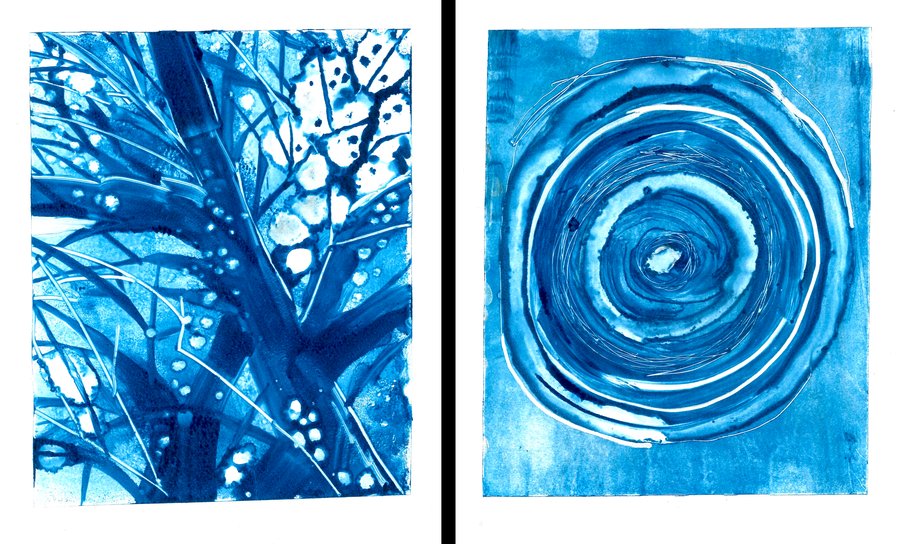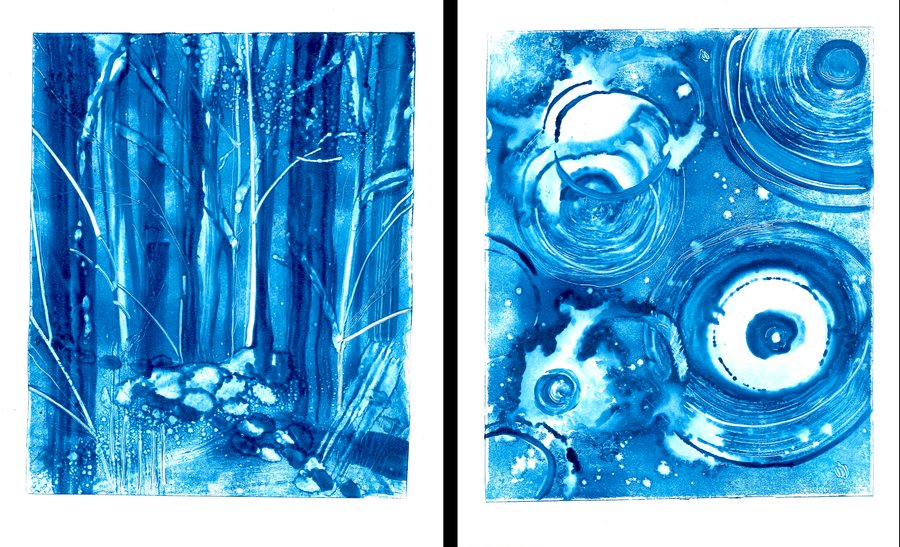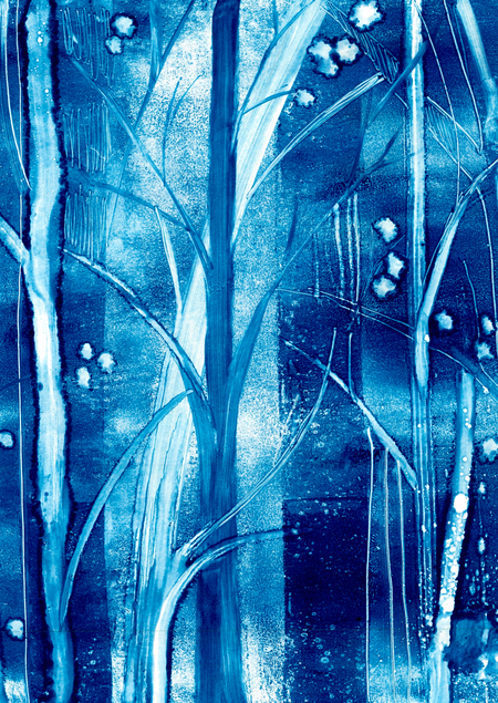 Серия посвящена холодному декабрю и застывшей на несколько месяцев жизни. На картинах можно увидеть лужи, покрытые льдом, холодный замедленный город и тихий лес с голыми деревьями. Работы выполнены в технике монотипия, синий цвет задает зимнее настроение и передает ощущение наступающих морозов.