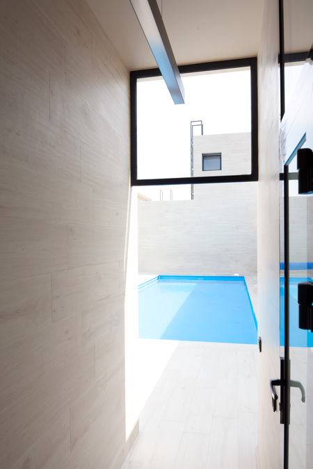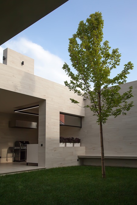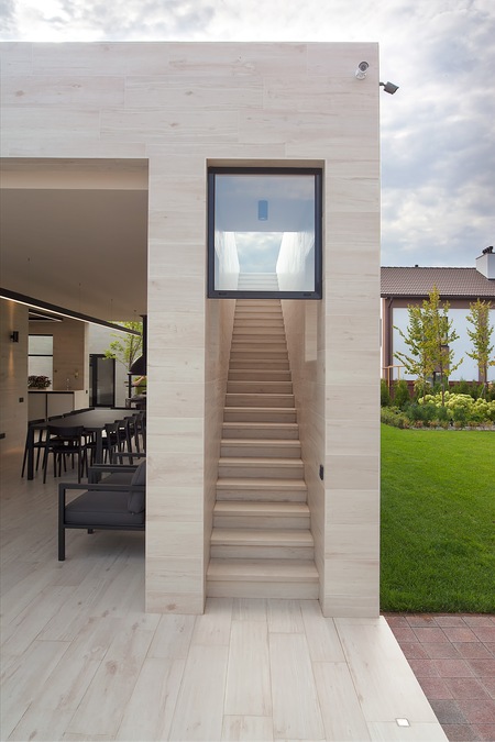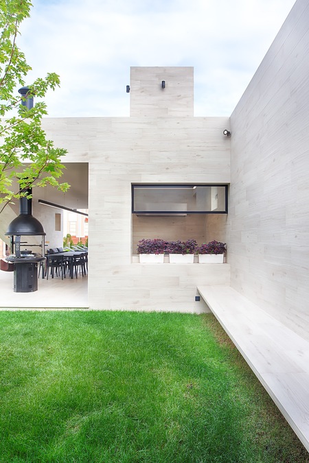Скучная, однообразная типовая застройка коттеджного поселка, жаркое лето и бунтарская натура заказчика породили этот объект. Он вальяжно растянулся вдоль южной стороны небольшого участка площадью 15 соток, занятого основным домом, который оставил совсем немного места для маневра. Мы попытались выстроить систему микропространств, увязанную в единую иерархическую цепочку. Возник блок с вычлененными нишами, позволяющими основному дому дышать, а в объекте — заложить интересный сценарий для летней жизни. Объект решен в мономатериале — керамограните, имитирующем брашированную доску, с разномасштабными, но одинаковыми по модулю пробивками, связывающим объект в единое целое.