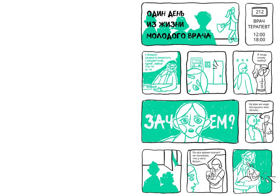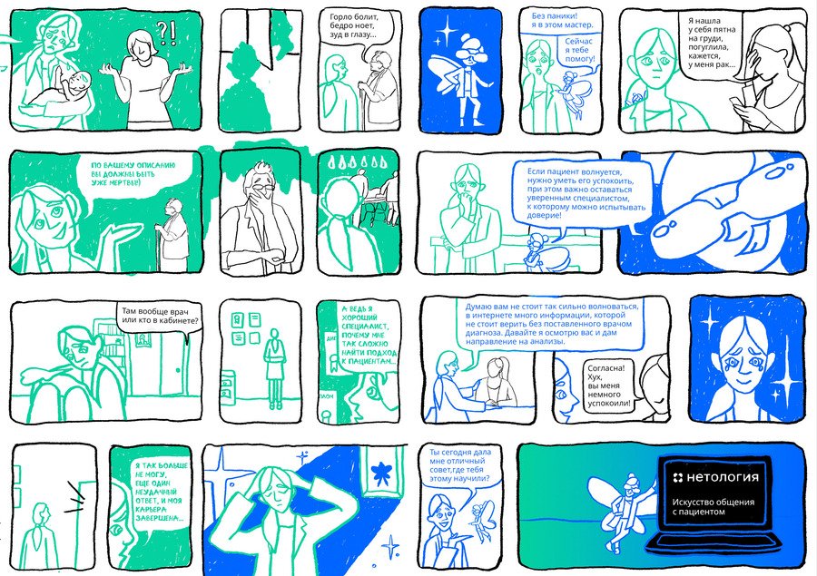 Цель брифа — создание стикерпака для медицинского направления «Нетологии». При создании персонажа было необходимо опираться на собственный комикс. Темой комикса стал конфликт в поликлинике.