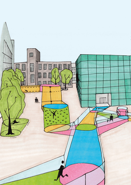 Для сохранения связи с графическим фасадом УКТ, я продолжила тему геометрии в благоустройстве территории. Но также хотела создать контраст между фасадом и окружающей средой, поэтому формообразование элементов благоустройства основано на кругах Клее, где они представляют из себя единую цепочку