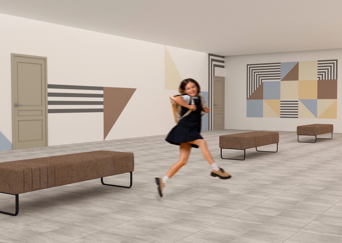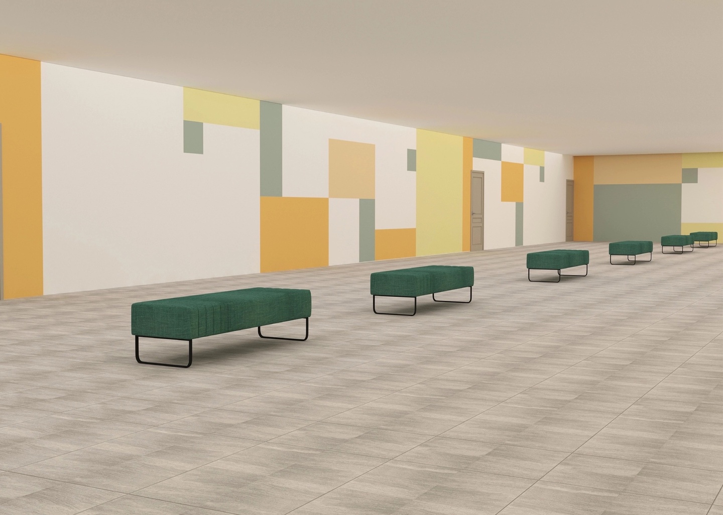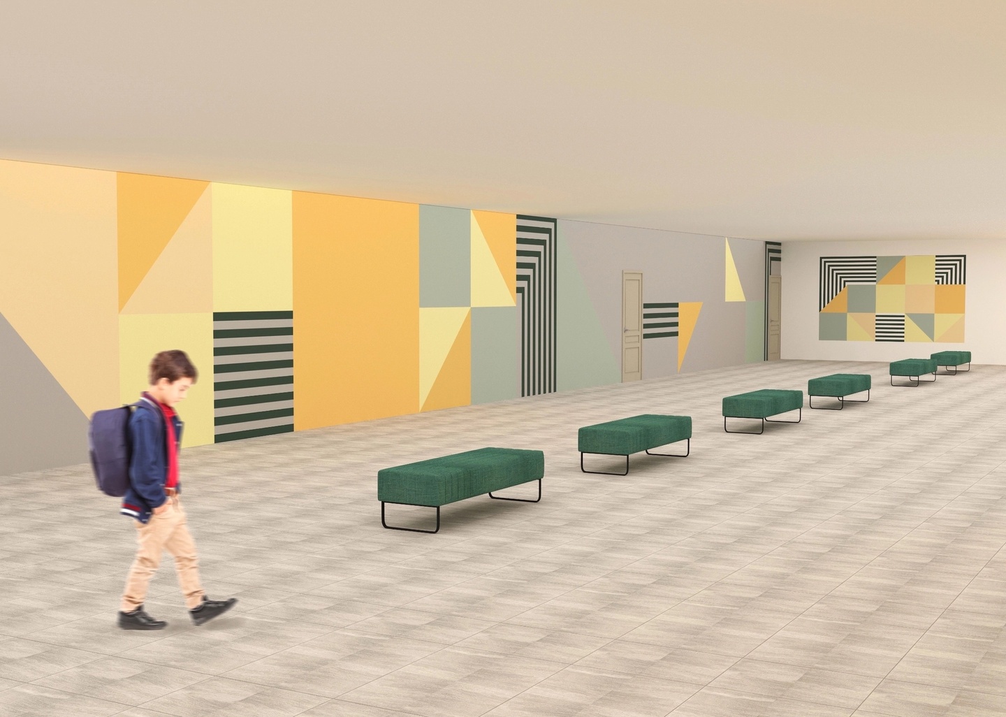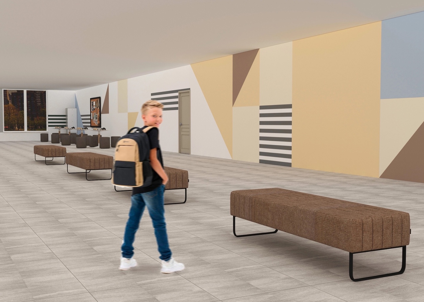 Зона отдыха представляет собой мягкие диванчики без спинки на протяжении всего коридора. На них ученики могут просто отдохнуть или подготовиться к следующему уроку.