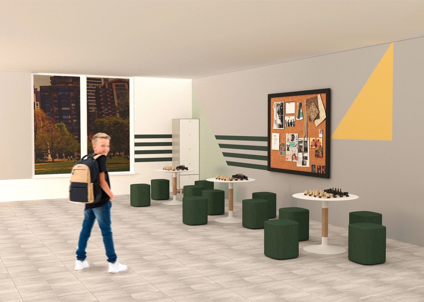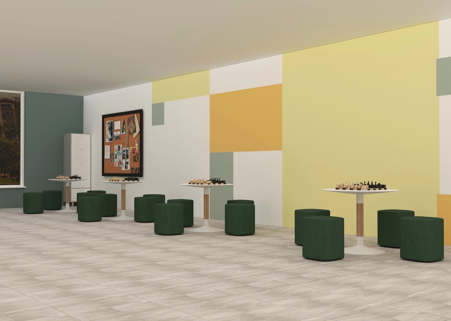 В зоне коворкинга располагаются столики и мягкие пуфы, на столиках расположены шахматы, в которые школьники могут играть на переменах, а также на стене висит пробковая доска, на которую ученики или учителя могут разместить что-угодно на своё усмотрение. В углу находится удобный шкафчик для хранения шахмат и прочих мелочей для пробковой доски.