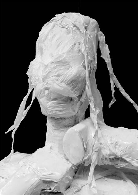 Нехватка воздуха — работа, посвященная тому, как с помощью перепотребления люди убивают планету, а вместе с ней и себя. В качестве воплощения чрезмерного потребления я решила взять пластиковые пакеты. При разложении и горении пластик выделяет токсичные вещества, именно поэтому моя скульптура душит себя: используя пластик, мы своими руками лишаем себя воздуха.
