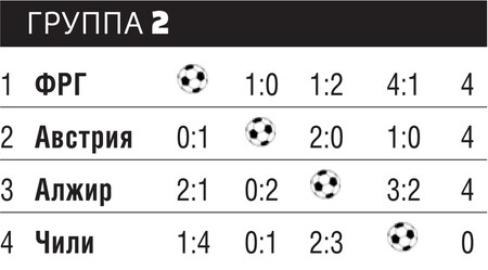 Оглушительная сенсация состоялась в первом же туре. Действующий чемпион Европы сборная ФРГ, прошедшая отборочный турнир без поражений, была бита командой Алжира — 2:1. Рабах Маджер, будущий обладатель Кубка чемпионов в составе «Порту», вывел африканцев вперед на 54-й минуте. Звездный форвард немцев Румменигге вскоре сравнял счет, но буквально через минуту удар лучшего футболиста Африки Беллуми принес Алжиру победу. В другом матче Австрия скромно победила Чили — 1:0. Во втором туре немцы реабилитировались, разгромив Чили со счетом 4:1, Алжир же уступил Австрии — 0:2.