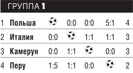 До начала игр мало кто сомневался, что итальянцы с поляками без особых проблем пройдут групповой этап. Однако команда Энцо Беарзота решила эту задачу с трудом. Полузащита, ведомая Антоньони, никак не могла наладить взаимопонимание с тремя форвардами: Конти, Росси и Грациани, которым пришлось полагаться на свои силы. В матче с поляками, который стал 100-м в сборной для голкипера Дино Дзоффа, итальянцы создали минимум опасных моментов, хотя один из них — на 80-й минуте — должен был закончиться голом: Тарделли бил по пустым воротам, но попал в перекладину. Похожая ситуация наблюдалась и в последующих играх «скуадры адзурры», у которой самым активным был Бруно Конти. Он забил гол в матче с Перу, а в игре с Камеруном цель поразил Грациани — ему в этом помог, правда, вратарь Н’Коно, внезапно споткнувшийся во время выхода за верховым мячом. Трех бесцветных ничьих для выхода в следующий круг итальянцам хватило. Тренер Энцо Беарзот горячо отверг все нападки журналистов на невнятную игру сборной: «Четыре года назад мы отлично начали чемпионат и сдали к концу. Лучше начать не так ярко, зато закончить хорошо».
