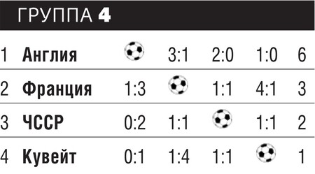 В первом же матче четвертой группы англичанин Брайан Робсон забил самый быстрый гол турнира. Когда он поразил ворота француза Эттори, часы отсчитывали лишь 27-ю секунду встречи. Французы вскоре сравняли счет, но Англия довела матч до победы — 3:1. В другом поединке дебютант турниров высшего ранга сборная Кувейта смогла сыграть вничью с Чехословакией. Позднее выяснится, что этот результат подорвет шансы сборной ЧССР на выход в следующий круг. Во втором туре чехословаки избрали защитную тактику во встрече с Англией. Счет по угловым после первого тайма был 12:0 в пользу британцев, счет на табло — 0:0. Во второй половине игры уставшие чехословаки начали ошибаться и в итоге уступили 0:2. Ничья в последней встрече с французами им ничего не дала. При счете 1:1 (второй пенальти подряд забил на этом первенстве мира признанный мастер таких ударов Антонин Паненка) чехословаки имели хорошие шансы забить победный гол, но удаление с поля нападающего Визека смешало им все карты.