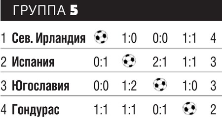 Перед началом турнира Гондурас не воспринимали всерьез, а североирландцев единодушно признавали самыми слабыми из европейских участников. Но игра рассудила иначе. Хозяевам турнира — испанцам — в первом же матче с Гондурасом удалось уйти от поражения лишь с сомнительного пенальти. В другом матче признанные фавориты также разочаровали — югославы не смогли взломать эшелонированную оборону сборной Северной Ирландии, сыграв вничью 0:0. Центральный матч группы между Испанией и Югославией начался красивыми и острыми атаками команды с Балкан, которые уже на 10-й минуте воплотил в гол Иван Гудель. Неизвестно, как сложился бы матч, не помоги хозяевам арбитр из Дании Лунд-Сёренсен. Защитник Заец сбил Алонсо явно за пределами штрафной, но судья без сомнений назначил пенальти. И даже это могло не спасти испанцев, поскольку Уфарте пробил мимо ворот, но… арбитр потребовал повторить удар! По его мнению, вратарь Пантелич слишком рано сдвинулся с места. Сменивший Уфарте Хуанито был точен. Гол не сломил югославов, они продолжали атаковать, но им катастрофически не везло. А испанцы забили еще раз, но уже без помощи арбитра.