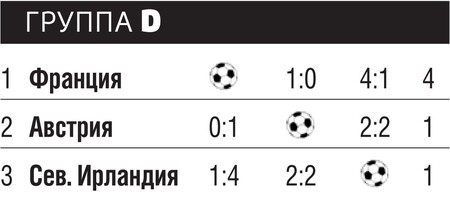 Франция уверенно доказала свое преимущество над соперниками по группе. Такой исход предполагался, однако присущая французам элегантность игры в сочетании с невероятной изобретательностью полузащиты заставили специалистов пересмотреть свое мнение относительно шансов «трехцветных» на победу в чемпионате. В матче с австрийцами мяч, правда, никак не хотел залетать в ворота — победа с минимальным счетом была достигнута благодаря мастерски исполненному Женгини штрафному. Реализуй французы хотя бы часть созданных ими голевых моментов, результат был бы иным. Прямолинейные североирландцы пали под ударами Рошто и Жиресса, каждый из которых отметился дублем. Мощные защитники соперника просто не успевали за перемещениями французов. Только их замедленной реакцией можно объяснить то, что невысокий Жиресс один из своих мячей забил головой!