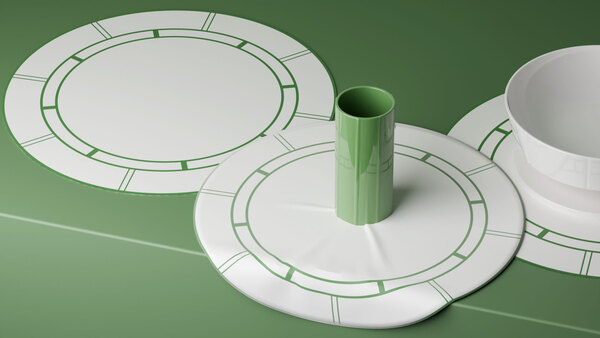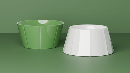 The collection consists of glasses, fruit, sauce, candles in a glass, vases, animal bowls, napkins. Colour: White (RGB 255 248 247), green (RGB 120 151 117). Material: semi-farfort, frosting. Technology: casting.