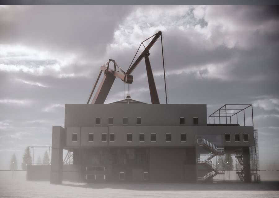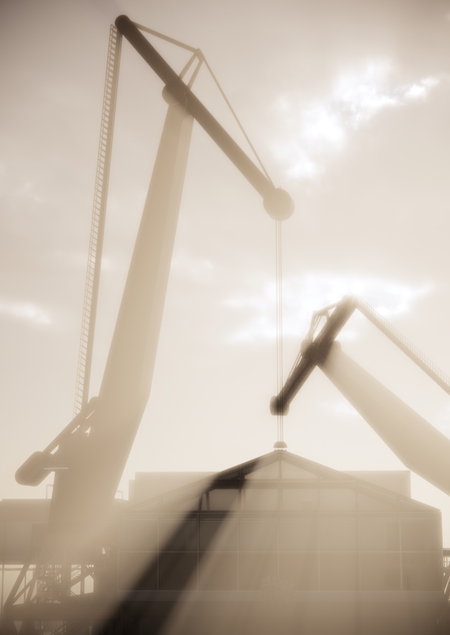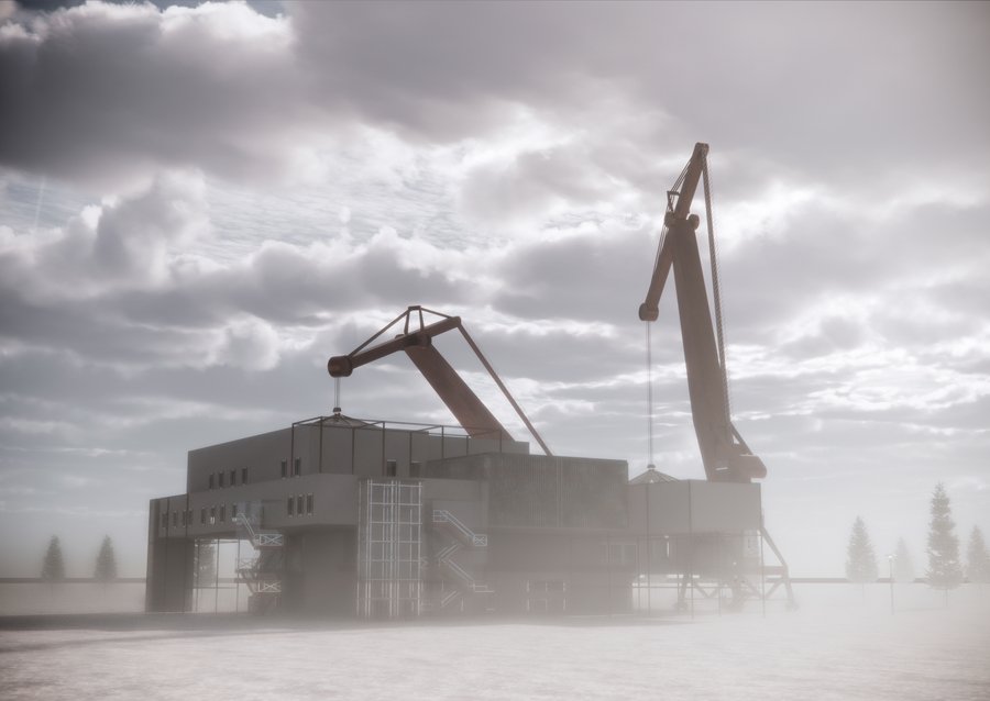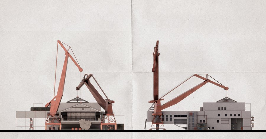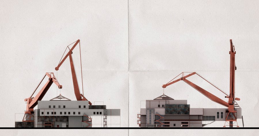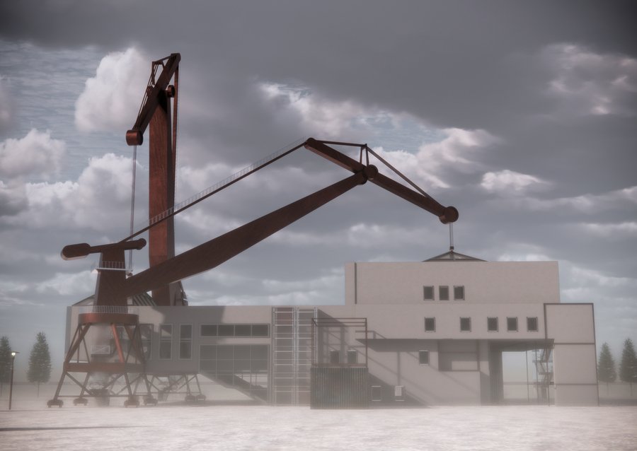 поверхности кранов и контейнеров намеренно ржавые, ведь эту ржавчину оставили морские волны.