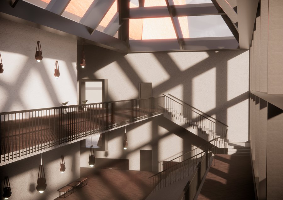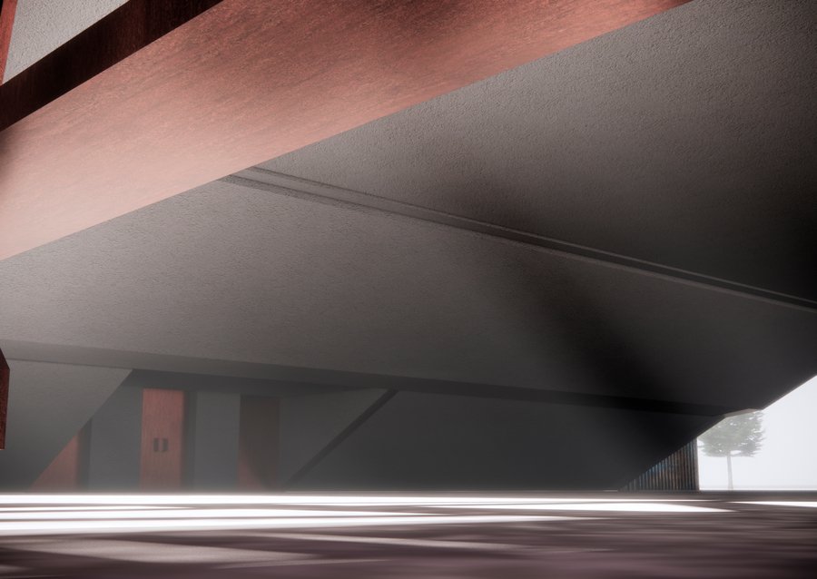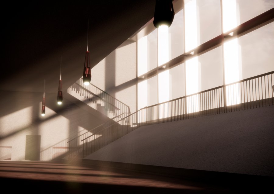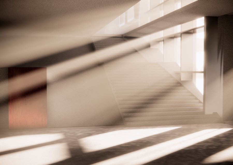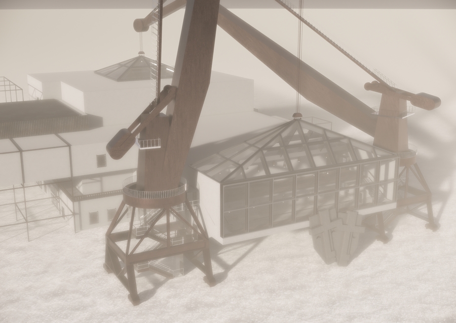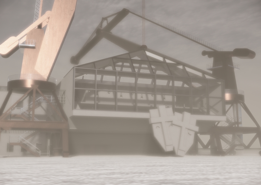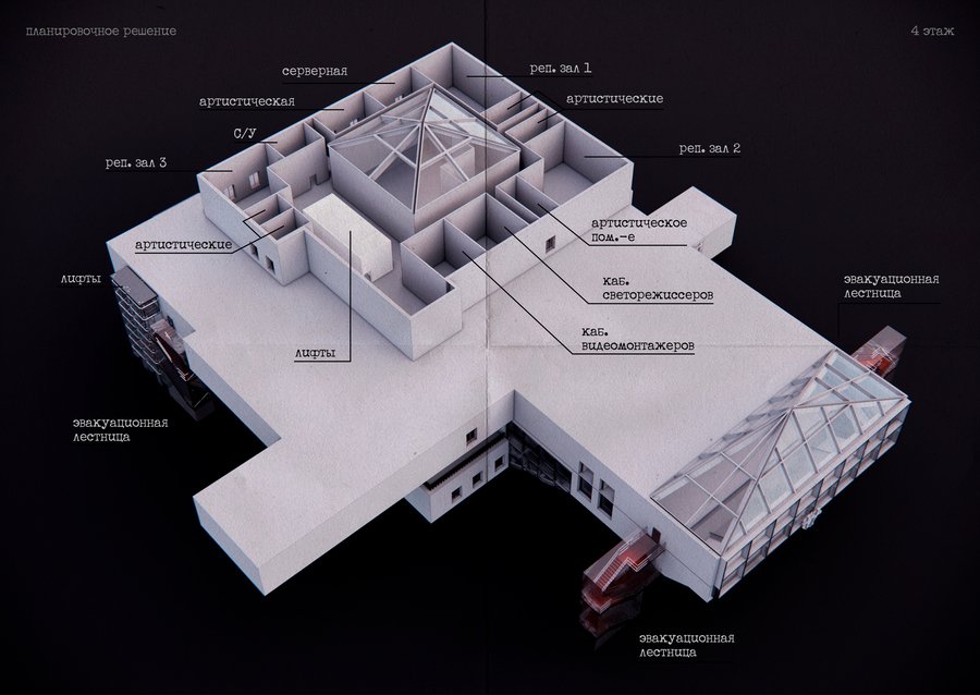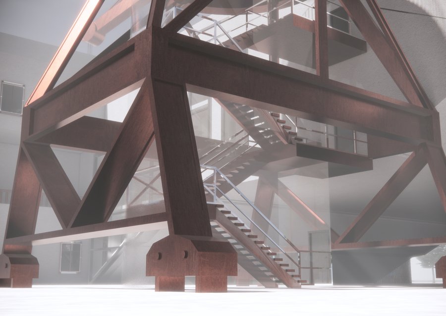 портовые краны, тянущие вверх стекла световых колодцев, симметрично облицовывают эвакуационные лестницы.