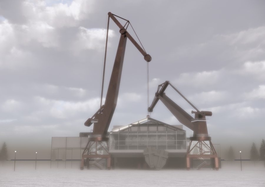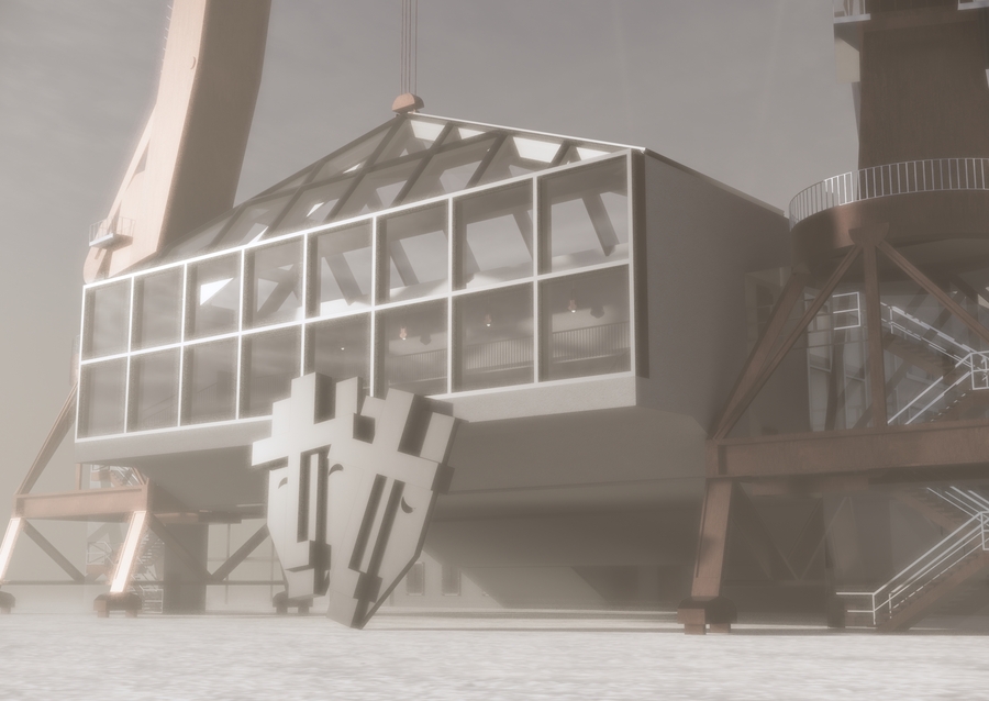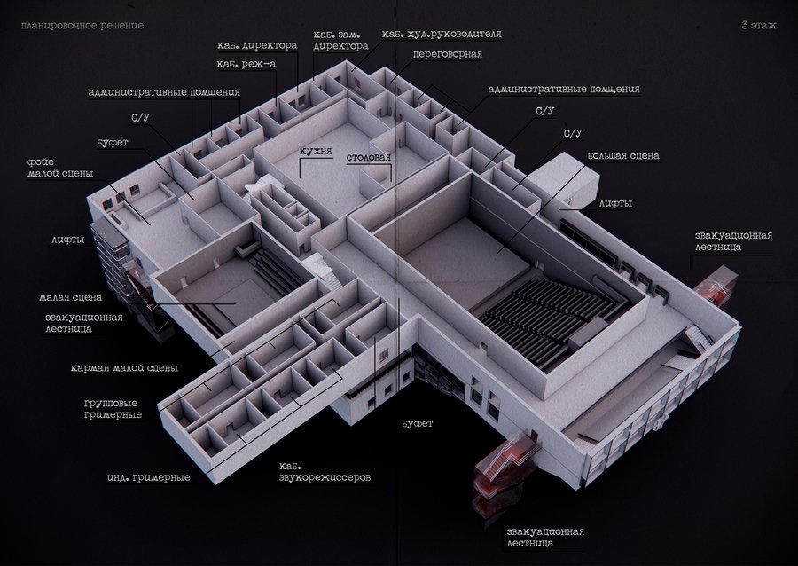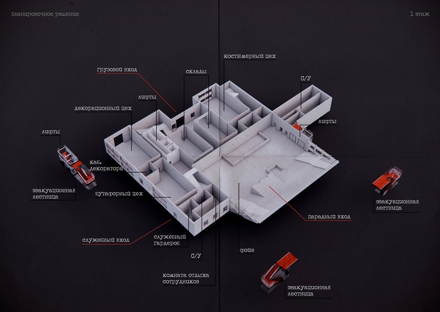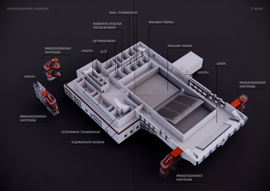 первые два этажа театра образуют поднятый «нос» корабля. на этот корабль опускаются грузовые контейнеры, складывающиеся в помещения. некоторые «выпадающие контейнеры» облицованы гофрированной сталью.
