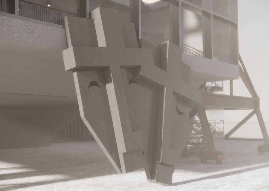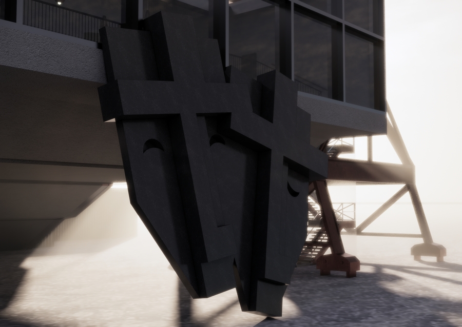 элементы из скульптуры «Маска Скорби» переходят в театральные маски.