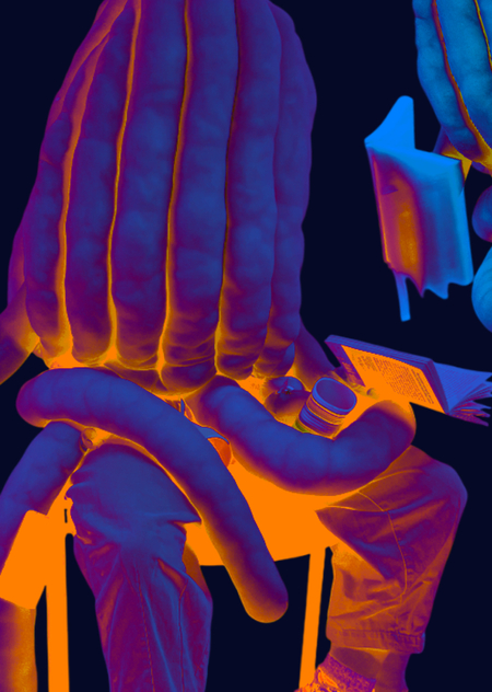 Этот образ ляжет в основу перформанса на предстоящей выставке. Художник в костюме осьминога будет механически перебирать пальцами экраны с бесконечной лентой, имитируя цифровую зависимость и экзистенциальное истощение. Инсталляция дополнится горами из мусора — тех самых чайных пакетиков, фантиков и пустых упаковок — как метафорой потребительского автоматизма и психической фрагментации.