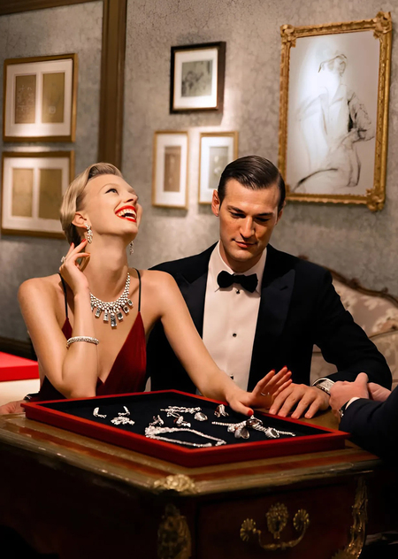 Освещение играет ключевую роль в создании атмосферы — оно мягкое, естественное и тёплое, что помогает подчеркнуть блеск и текстуру золота, а также создаёт ощущение уюта и доверия. Такой подход к свету усиливает эмоциональное воздействие рекламы, делая её не просто презентацией продукта, а визуальной историей о любви и связи.