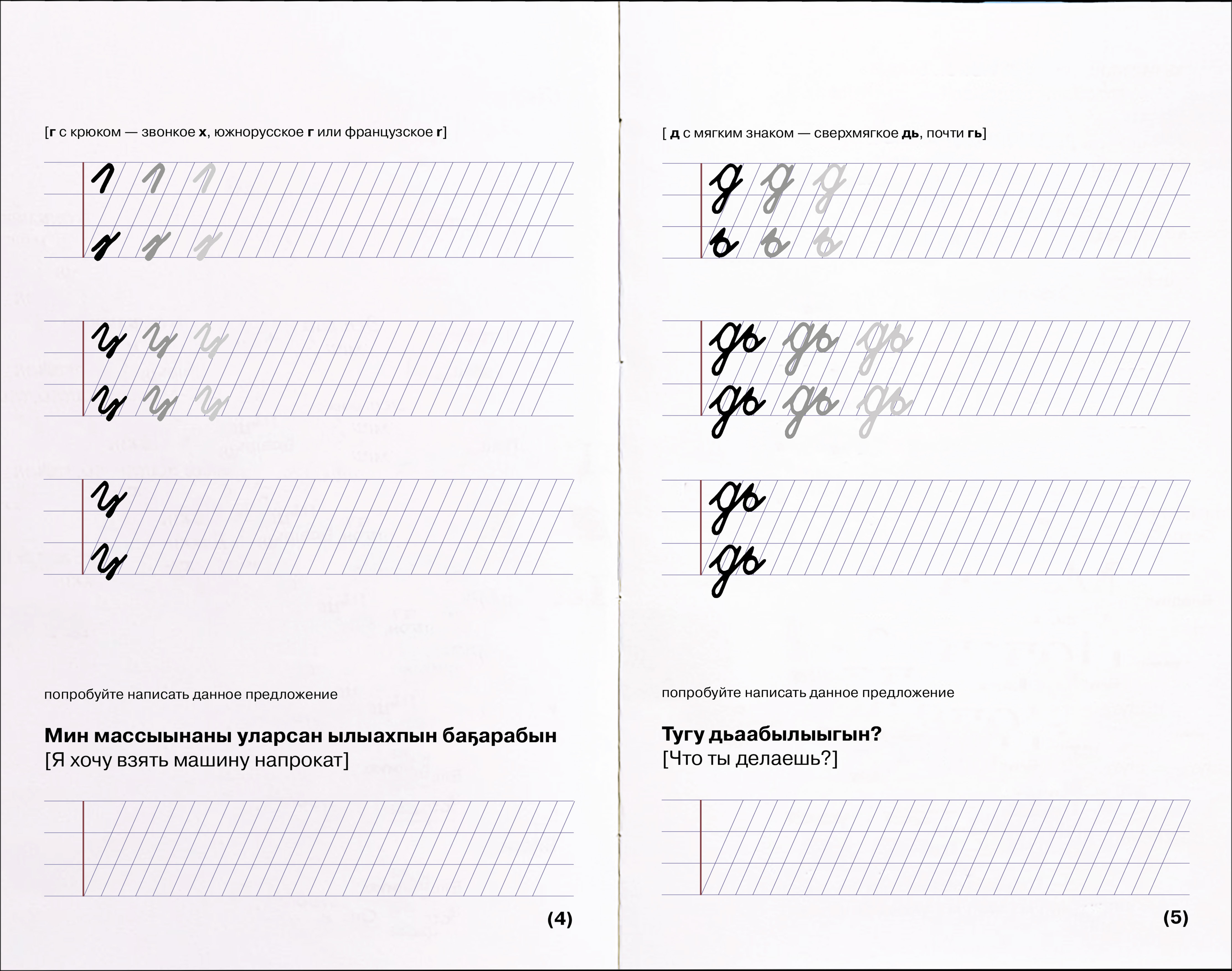 Each page has an explanation of the pronunciation of the letter, individual elements to understand the principles of writing, the letter itself and the proposal in the Yakut language to write it in conjunction with other letters.