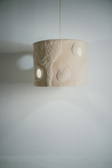 Мазур Елена, Helen Loom Концепция и функция предмета: освещение, декоративный свет, светильник. Техника, технология, материалы: сухое валяние, войлок из 100% шерсти мериноса (необычайно мягкий и прочный, с естественными вкраплениями примесей растительного и минерального происхождения), шерсть мериноса, металлический каркас Вес, габаритные размеры: 4 кг, 700/500 мм Год создания: 2024 Тираж и цена: индивидуальные изделия под заказ, 120 000 ₽