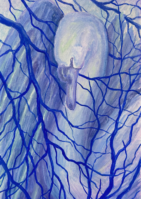 В своей дипломной работе я исследую страх, визуализируя его в живописной серии и предлагая своё видение борьбы с ним через созданные обереги.