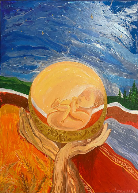 Новорожденный Кирам, лежит в теплом пространстве в виде небесных светил — Солнца и Луны. Луна расписана в татарский орнамент. Также месяц указывает на основную религию Республики — ислам. Солнце — это мужская энергия, Луна — женская, в их гармоничном соединении человек находит духовный баланс. Кирама держат родители: мужская и женская рука. Они выглядят в виде Древа Рода, которое стоит на плодородной земле, омываемой реками. Так как это наследник к нему направлена — красная ковровая дорожка, которая символизирует богатство, власть и статус. Флаг Татарстана написан в виде природного ландшафта и задает локацию исторического события. Зеленый — зелень, возрождение; белый- чистота, реки; красный- земля, жизнь, энергия. Размер картины: 50×70 см Материал: акрил Холст