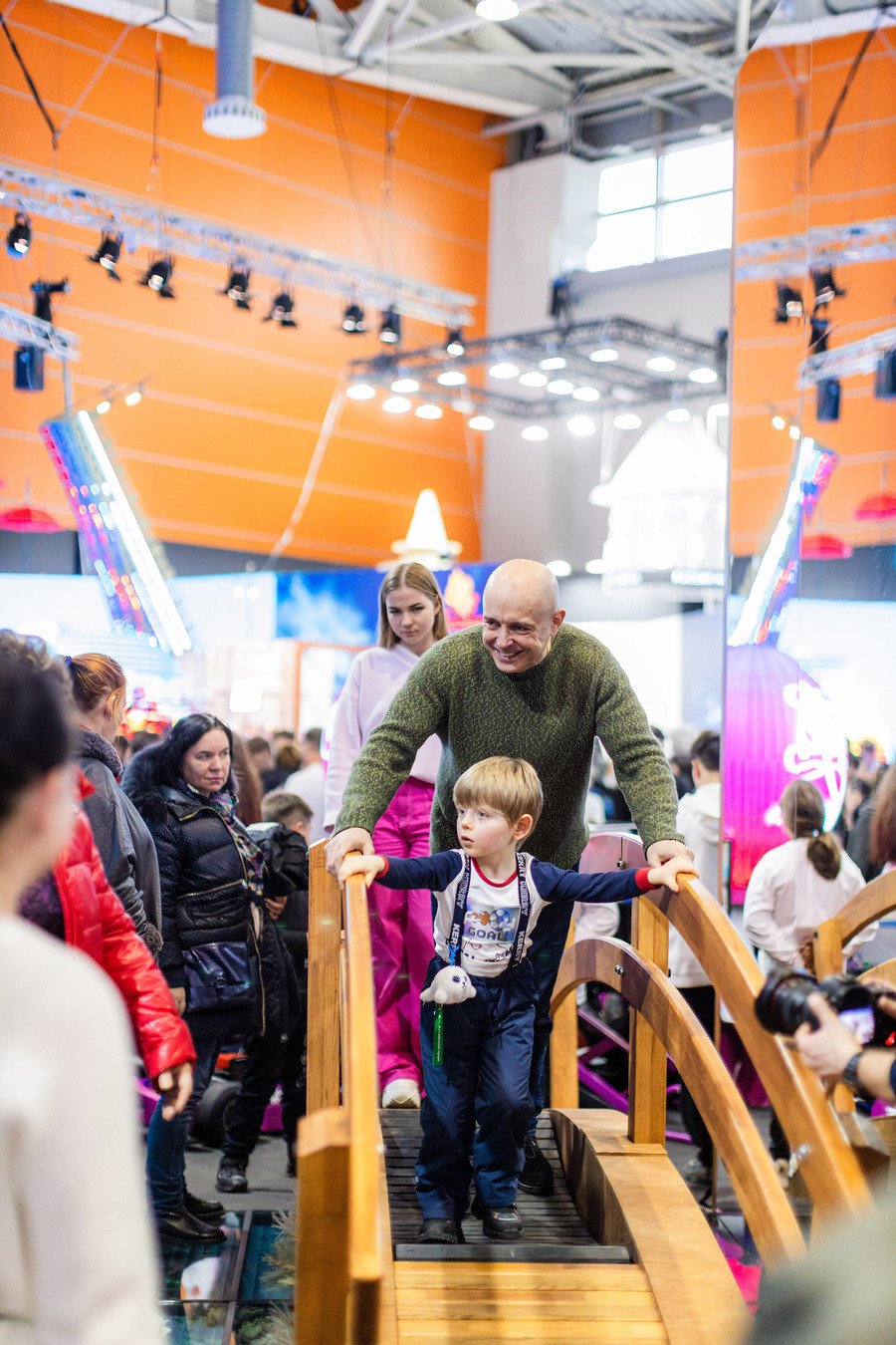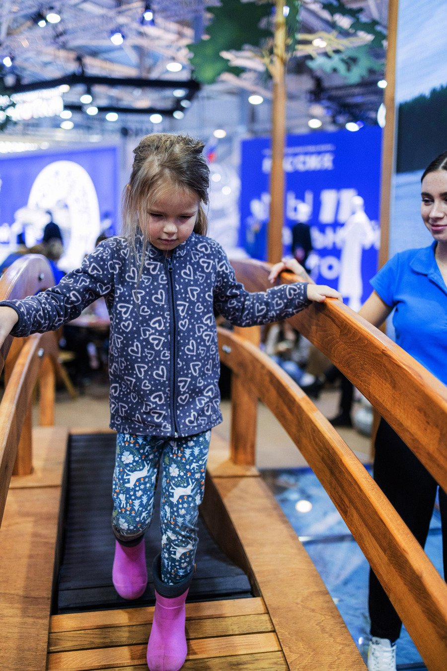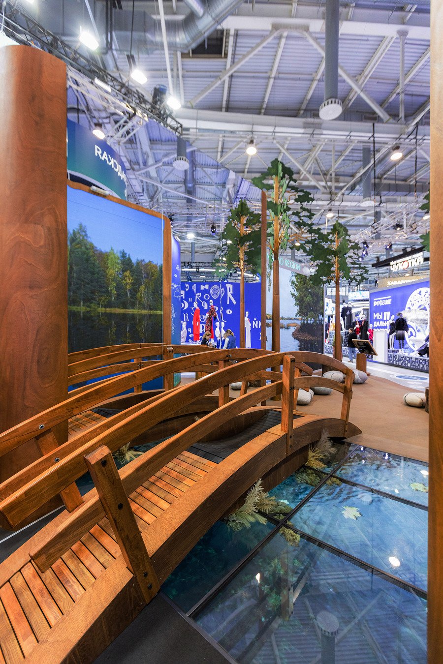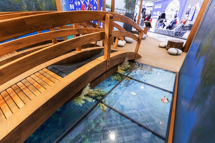 Один из элементов стенда — беговая дорожка на мостике. Пока человек идет, справа и слева от него одновременно меняется пейзаж на экране, где демонстрируется выборгский парк «Монрепо».