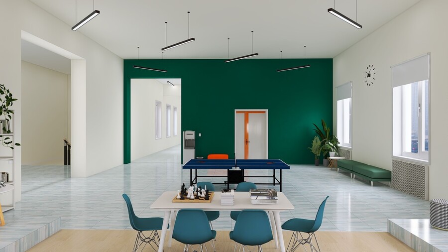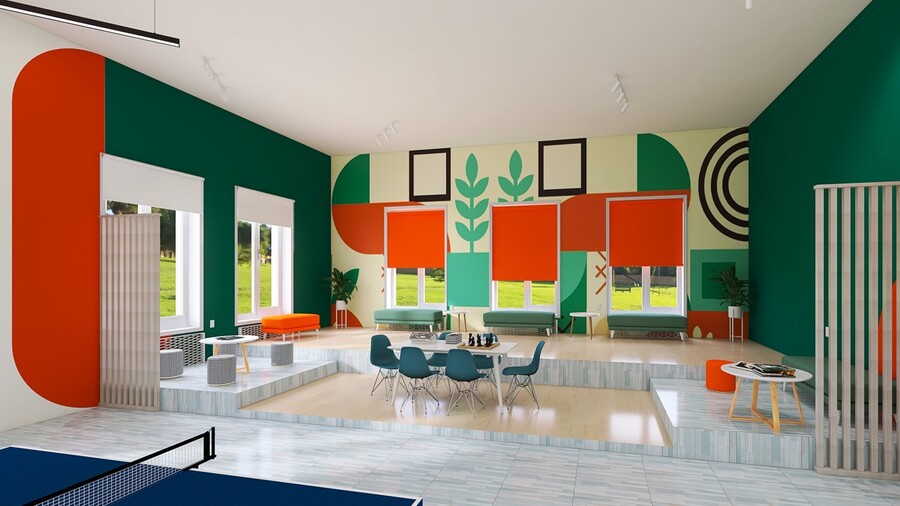 На втором этаже Спасской СОШ расположена крупная рекреация. Поскольку в школе нет актового зала, она используется вместо него. Было принято решение сделать подиум. В обычное время он используется как зона отдыха, а во время мероприятий трансформируется в сцену. Оформление стен в общей цветовой палитре школы. Используются фирменные элементы.