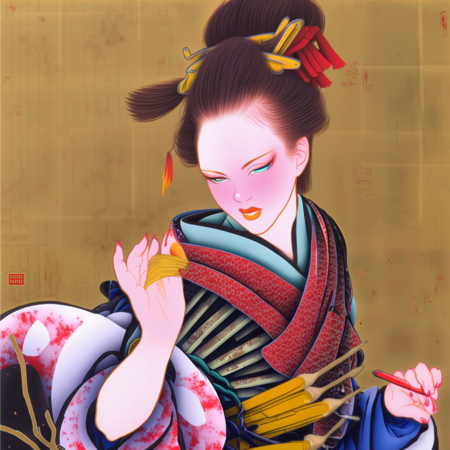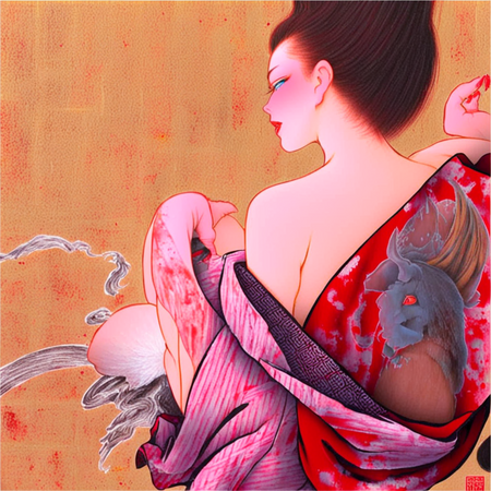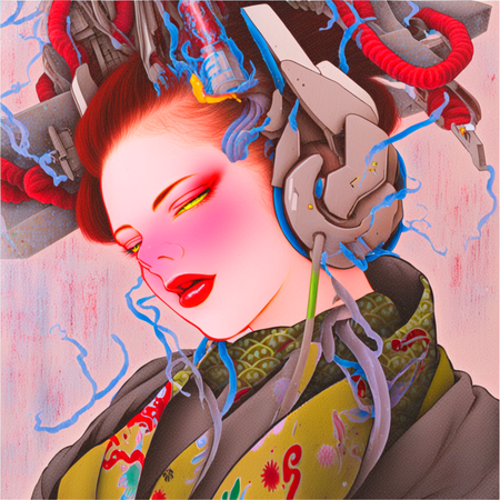 В генерациях я решила попробовать разнообразить традиционные образы гейш и добавить сюжеты японской мифологии и футуристичной эстетики киберпанка