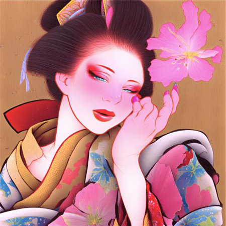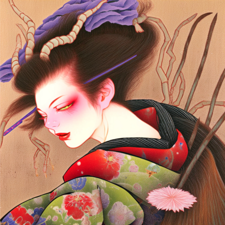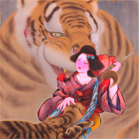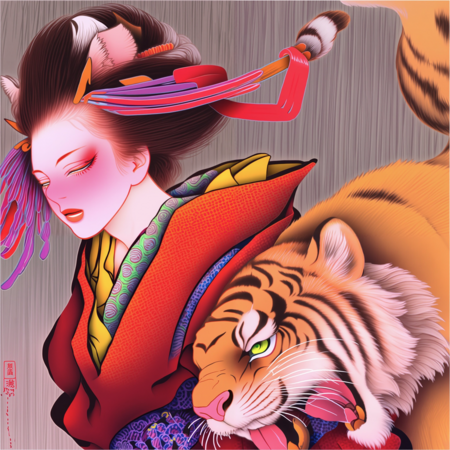 «an artwork in Tamura Yoshiyasu style, a painting of a woman in a kimono and tiger next to her»; «an artwork in Tamura Yoshiyasu style, a painting of a woman in a kimono with pink flower»