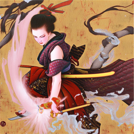 «an artwork in Tamura Yoshiyasu style, a painting of a woman samurai in kimono with a katana sword»