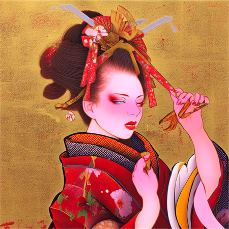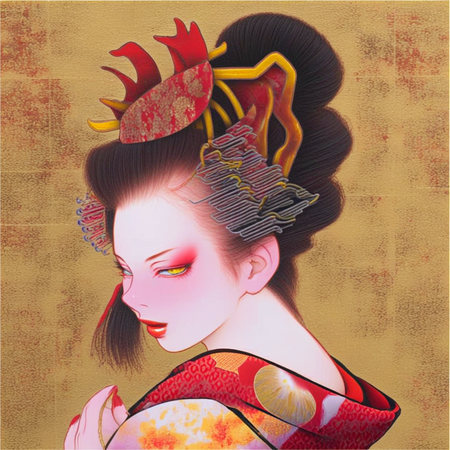 В целом, изображения достаточно точно отражают стиль выбранного художника и создают единое целое. Гейш можно изобразить в мифологических сюжетах, с животными и в полноразмерных позах. Основное отличие заключается в детальной передаче текстуры фона из сусального золота и некоторых других мелких элементов.
