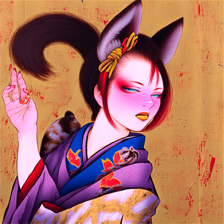 «an artwork in Tamura Yoshiyasu style, a painting of a woman in kimono, with ears and tail»