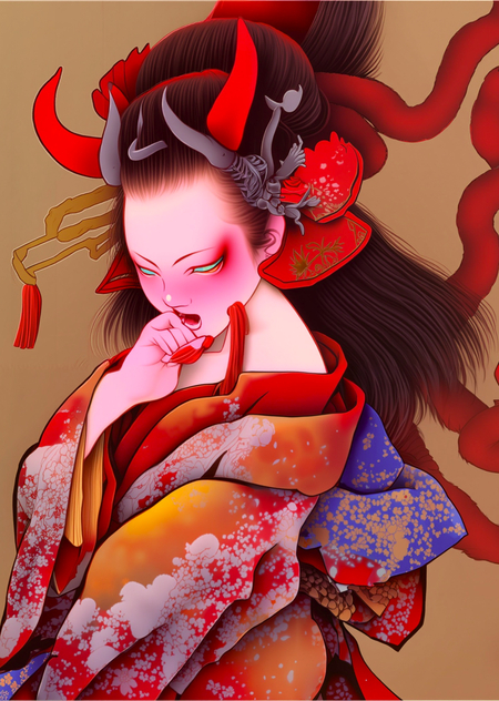 «an artwork in Tamura Yoshiyasu style, a painting of a demon-woman in a red kimono, oni, Japanese mythology»