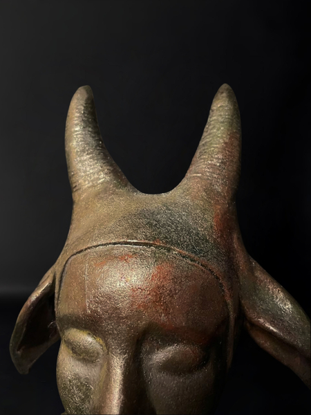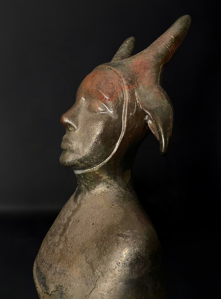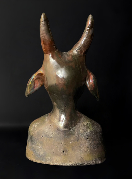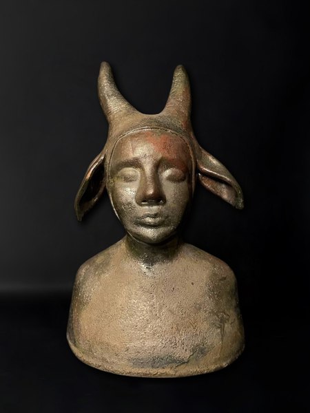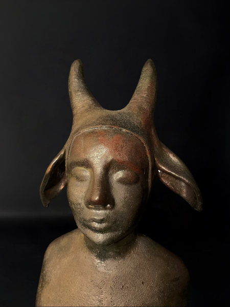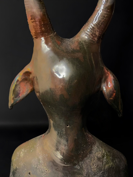 Скульптура человека в гибридном облике антилопы, словно возникла из глубины древнего мифа. Удлинённые, мягко ниспадающие уши и изящные рожки создают образ одновременно хрупкий и пугающий. Фактура работы сохраняет следы огня: где-то глазурь пузырится, как расплавленный лёд, где-то — обнажает грубую керамическую плоть. Это не просто скульптура, а слепок мгновения. Образ балансирует между человеческим и звериным, между миром духов и явью. Наклон головы придают фигуре меланхоличное выражение — словно это существо застыло в момент тихой печали или глубокого раздумья. Глазурь создает эффект движения: кажется, что при изменении угла зрения скульптура оживает, демонстрируя то свою человеческую, то животную природу.