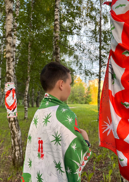Выставка платков проходит в парке имени 50-летия Октября. Зрители и автор активно взаимодействуют с продуктом искусства, принимая участие в перформативной экспозиции. Действие начинается с прижатия платков к плечам, что символизирует приветствие. Позднее люди связывают четыре полотна между собой и напрямую визуализируют объединение. Надевая платки на голову и оборачивая тканями деревья, участники создают особое энергетическое поле, ведь в этот момент они взаимодействуют. Завершается экспозиция привязыванием платков к качелям в парке.