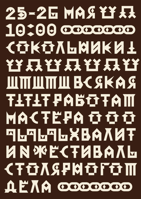 В основу Rezba Font легли принцип построения и элементы домовой резьбы. Используя часто встречающиеся детали из наличников, фронтонов, стенных подзоров и щипцов, я стремилась сделать не столько и не только шрифт, сколько набор символов, созвучный древнему русскому промыслу и отражающий силу и дух народа.